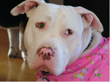 My mom has told me about her first dogchild. A springer spaniel/pit bull mix. She says when she looks at your face she sees a lot of Samson in it. But Samson had some black on him(I've seen pictures) and right where your bow is he had a black circle. At least you got someone to take yours off!